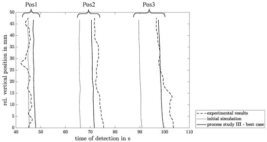 The assumption of varying compaction in the radii of the test structure can be confirmed on the basis of the performed optimization of the simulation. Table 5 shows the calculated RMSE between the simulations performed and the measurements. As mentioned in Section 2.3, an increased compaction of the fibers can be assumed in the mold parting plane (). Furthermore, in the upper and lower radii of the test structure, a lower compaction can be assumed (), which supports the theory of the presence of a flow channel in this region. The results show that a decrease in the compaction in the radius of the top and bottom edges leads to a decrease in the RMSE by about 70% over the entire flow path of the test structure and thus to a better conformity with the measured values. While the adjustment of leads to a significant improvement, the adjustment of the compaction does not significantly change the RMSE and thus has a minor effect on the mold filling process. In relation to the mean RSME, the following can be seen that the process study III with the settings of and shows, with an average of 2.25 s, the best case for the simulations carried out. This is also shown graphically in Figure 14 by comparing the detection time of the initial simulation, the best case simulation, and the PAUT-measured values, respectively.