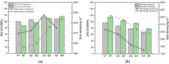 The 28d UCS and bulk density of CSRPC with different CS substitution rates: (a) Comparison group A and B (b) Comparison group C and D.