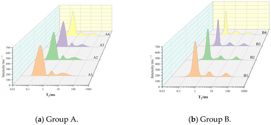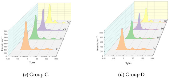 It can be seen in Equation (3) that there is a close relationship between the pore size r and the transverse relaxation time T2, so the pore size distribution of CSRPC can be obtained by the T2 spectrum. According to the size of the pore, the pore of CSRPC can be divided into three types: micro-pore: 10−4 μm ≤ r < 10−2 μm (0.01 ms ≤ T2 < 1 ms); meso-pore: 10−2 μm ≤ r < 1 μm (1 ms ≤ T2 < 102 ms); and macro-pore: 1 μm ≤ r < 100 μm (102 ≤ T2 < 104 ms). Figure 4a–d show the T2 spectrum of CSRPC in groups A ~ D, respectively.