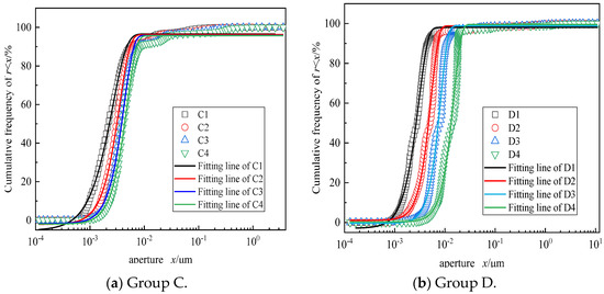 where R(x) is the cumulative frequency of the proportion of pores smaller than the size of x, X is the characteristic pore size, and n is the uniformity coefficient of the model size distribution. The effect of fitting the pore size distribution with Equation (9) is shown in Figure 5a,b.