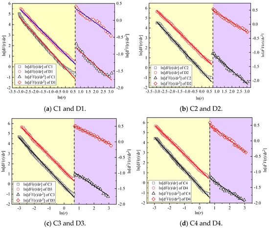 Figure 6a–d show the fractal dimension fitting curves of QSRPC in group C and CSRPC in group D. Table 8 shows the calculation results of the fractal dimensions Dl and DS and fractal characteristic parameter T.