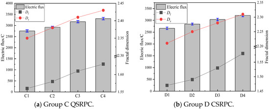 As the electric conductivity changes with time, electric flux is used to represent the chloride ion diffusion characteristics. Figure 7a,b show the electric flux and fractal dimension of QSRPC in Group C and CSRPC in Group D after 6 h of DC power on, respectively.