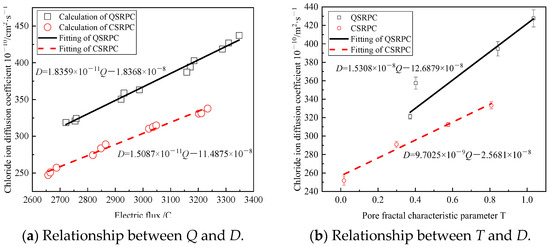The chloride ion diffusion coefficient D can be calculated by Equation (17), and the relationship of the calculated chloride ion diffusion coefficient D and electric flux of CSRPC and QSRPC are shown in Figure 8a; D is significantly reduced and lower than QSRPC. Therefore, by modifying Equation (17), we can obtain:
