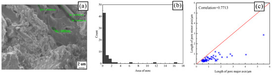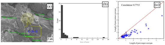 CSRPC with a CS substitution rate = 100% (a) SEM; (b) pore area; (c) the correlation of the length of the major and minor axes.