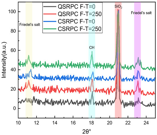 It can be seen in Table 9 that the content of Friedel’s salt and CH in QSRPC and CSRPC after 250 freeze–thaw cycles is higher than before freeze–thaw cycles, while the content of CaSiO3 after 250 freeze–thaw cycles is less than the freeze–thaw cycles. The content of Friedel’s salt of CSRPC is less than QSRPC, whether before or after the freeze and thaw cycles. The crack caused by the expansion of Friedel’s salt in water has less influence on CSRPC.