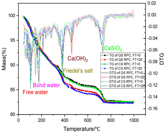 As can be seen in Figure 13, the main components of CSRPC and QSRPC are Friedel’s salt, CH, and SiO2. As can be seen in Figure 14, the first to the fifth peaks of the DTG curves are located at 20~100 °C, 100~200 °C, 310~380 °C, 400~450 °C, and 700~800 °C, respectively, which are caused by the evaporation of free water, C-S-H dehydroxylation, the decomposition of Friedel’s salt, the decomposition of CH, and the decarburization of calcium silicate, respectively.