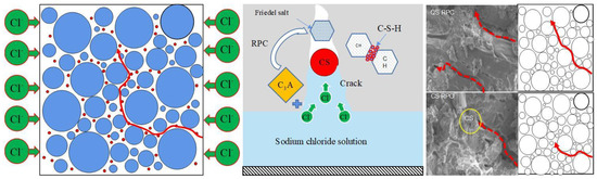 - When chloride ion diffuses into RPC, one part is absorbed and solidified by C-S-H gel, and the other part reacts with aluminum hydrate to generate Friedel’s salt, whose volume will expand when encountering water, filling small pores, refining large pores, and increasing the compactness of RPC after freeze–thaw damage. The active silica in CS reacts with the cement hydration product CH to form C-S-H gel, enhancing the chloride ion diffusion resistance of CSRPC after freeze–thaw cycles.