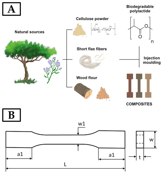 Scheme of obtaining composites with different types of biofillers of plant origin (A); sample shape and dimensions (B).
