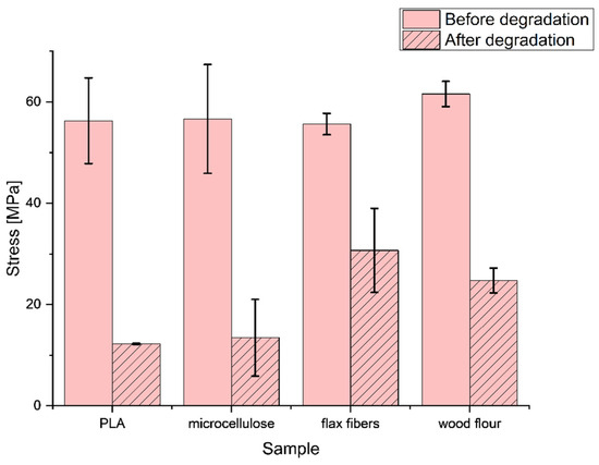 The curves in Figure 3 clearly show that during the aging process, the characteristics of the mechanical properties of the investigated composites changed. The samples before aging could hold stress in a similar range—70–80 MPa. In this case, the best performance was observed for microcellulose composites, but the increase in properties was comparatively low (5%). Those experiments concluded that the role and influence of the cellulose additives on the strength of the obtained composites were slight and infeasible. The values obtained from the mechanical tests of the freshly produced samples of both the pure PLA and biocomposites were very similar and fluctuated in the range of +/−8% in relation to the value of the mechanical properties obtained for the pure PLA. We observed an interesting effect during the examination of samples after the aging process: a dramatic decrease in stress and strain. Significantly different impacts on the composite’s properties were revealed depending on the biofiller.