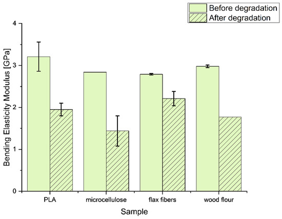 The tensile strengths of the composite and reference samples were similar to each other, except for the PLA samples with wood particles, where an increase of 9.4% was observed. After UV degradation, the tensile strength of all the samples decreased. The most significant decrease in mechanical strength was observed for the unmodified PLA sample; after UV degradation, the strength value was only 21.7% of the basic tensile strength. Samples containing microcellulose experienced a large decrease in strength values (23.8% tensile strength after degradation). The wood powder protected PLA from degradation; the measured strength was 40.2% of the strength against UV degradation. The highest protection against UV radiation was observed for PLA composites with flax fibers; it amounted to 55.2% of the initial value and, in general, among all the assessed samples, the PLA composite sample modified with flax fibers had the highest tensile strength after UV degradation. In Figure 5, for the bending elasticity, the modulus results from the measurements before and after the aging process are presented. The cellulose-based additives had a slight effect on the bending elasticity modulus, which can be seen in the slight decrease in values compared to pure PLA (Figure 4).