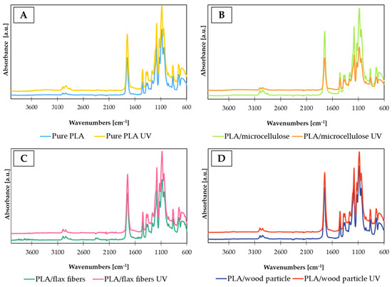 FTIR-ATR spectra of PLA (A) and biocomposites with (B) microcellulose, (C) flax fibers, and (D) wood particles before and after UV aging.