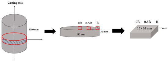 The Walsin Lihwa Corporation prepared a cylinder of the 316L cast billet with a diameter of 250 mm and 1000 mm in length. A disk with a diameter of 250 mm and a thickness of 30 mm was cut from the cast cylinder for experimental use. Figure 1 shows a schematic diagram of the test samples cut from the different locations of the disk. The cast billet was wire-cut and machined to obtain test pieces with a cross-section of approximately 10 mm × 10 mm and a thickness of 5 mm. For comparison, three samples, i.e., from the center, the 1/2 radius, and the radius, were wire cut from the disk of the cast billet. The chemical composition, in wt%, of the 316L cast billet is displayed in Table 1.