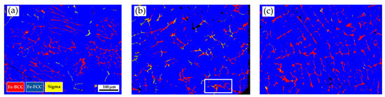 Figure 3 shows the EBSD phase maps of the as-cast 316L stainless steel billet at different locations. The step size used in Figure 3 was 1.3 μm. The cast structure exhibits a dendritic morphology, and the interdendritic δ-ferrite and sigma phases are widely observed in Figure 3. The as-cast billet possesses three phases, including δ-ferrite, sigma, and austenite. The microstructure of the three locations is quite different due to different cooling rates during casting. In Figure 3a, fragmented δ-ferrite (red) is observed in the austenite (blue) matrix in the center of the cast billet. In Figure 3b, the flaky δ-ferrite and sigma phase distributions are still quite uneven at 0.5 R. The distribution of flaky δ-ferrite and sigma phases is improved at the location of R, as displayed in Figure 3c. In Figure 3c, the amount of sigma phase is significantly decreased, and the flaky δ-ferrite becomes blunt at location R. Different microstructures of the cast billet at different locations are expected to result in different responses in the subsequent hot and cold drawings of the cast billet. A homogenization treatment of the cast billet is required before rolling.