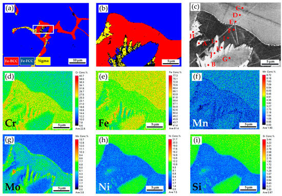 The as-cast 316L stainless steel billet at 0.5R: (a,b) EBSD phase maps in the area selected in Figure 3b; (c) EPMA BEI and quantitative chemical analyses of different locations; (d–i) EPMA WDS quantitative element mappings of Cr, Fe, Mn, Mo, Ni, and Si.