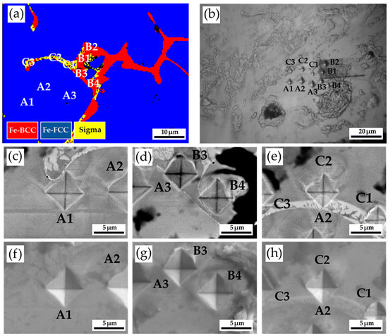 The Vickers hardness measurements of the as-cast 316L stainless steel billet at 0.5 R after homogenization at 1240 °C for 6 h, with furnace cooling: (a) EBSD phase map in the area selected in Figure 12; (b) the corresponding optical metallograph, with Vickers hardness dents of (a); Vickers hardness dents of EPMA (c–e) SEIs and (f–h) BEIs.