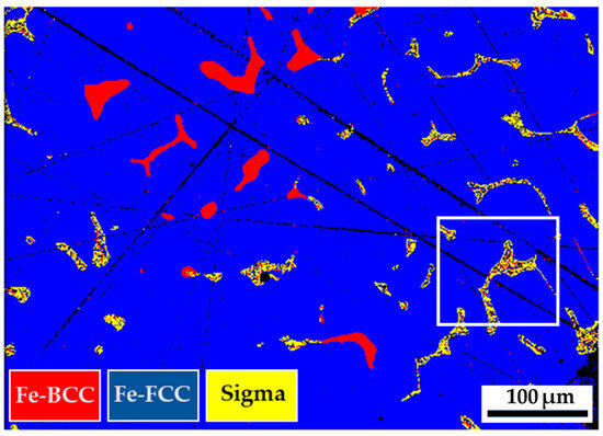 The EBSD phase map of the 316L stainless steel cast billet after homogenization at 1240 °C for 2 h, cooled to 850 °C with a slow furnace, followed by a fast air cooling to room temperature.