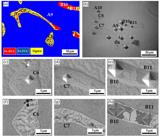 The Vickers hardness measurements of the as-cast 316L stainless steel billet at 0.5 R after homogenization at 1240 °C for 2 h, with air cooling: (a) EBSD phase map in the area selected in Figure 6b, (b) the corresponding EPMA SEI, with the Vickers hardness dents of (a); Vickers hardness dents of EPMA (c–e) BEIs and (f–h) SEIs.
