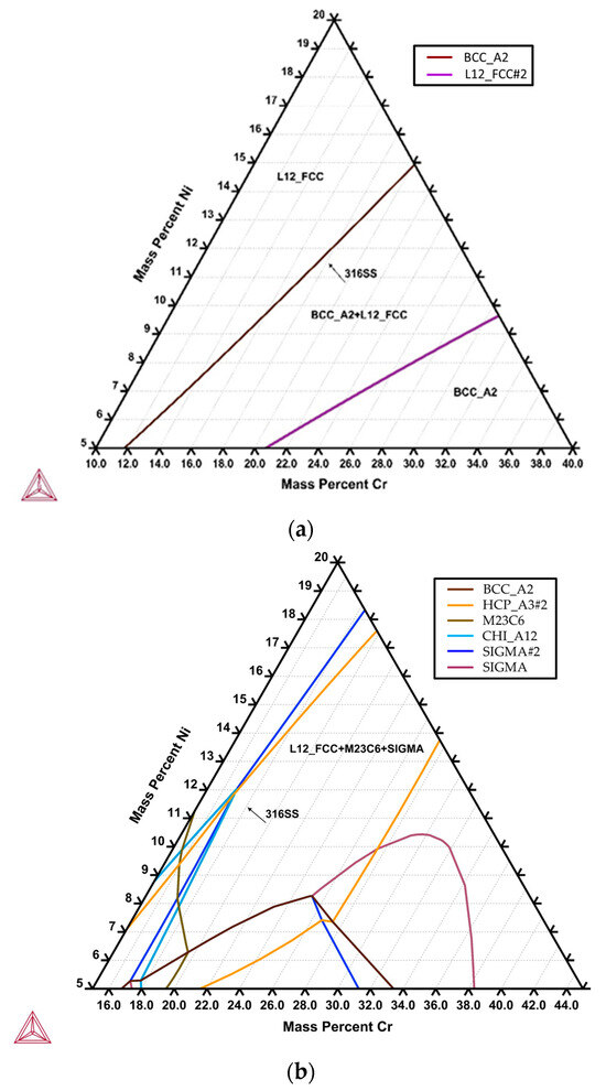 Figure 15 shows the isothermal sections of the 316L stainless steel at 1240 and 850 °C, respectively, simulated by Thermo-Calc. In Figure 15a, the chemical composition of the 316L cast billet is in the two-phase region, with δ-ferrite (BCC) and austenite (FCC), consistent with the experimental observation. According to Figure 15b, the equilibrium phases at 850 °C in the 316L stainless steel are FCC austenite, M23C6 carbide, and the sigma phase. The 316L cast billet is alloyed with a low carbon concentration of 0.02 wt%, so it is reasonable that the M23C6 carbide is not observed in the experiment. However, the δ-ferrite is not in an equilibrium phase at 850 °C in the isothermal section (Figure 15b). this is not consistent with the experimental observation. The Thermo-Calc simulation deviates from the experimental result. Because the formation of the sigma phase is a kinetic issue, i.e., a rate-dependent process, the simulation based on thermodynamics is not appropriate. The Thermo-Calc simulation is unsuitable, especially for the case of solid-state transformation due to slow diffusion to reach the final equilibrium state.
