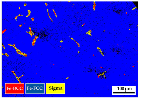 The minimum load of the Vickers microhardness test is 10 g, which is applied in the experiment to decrease the size of the hardness dent. The size of the microhardness dent is small enough to support the austenite matrix with a hardness below 200 Hv, and the variation in hardness values for the austenite is quite tiny. In contrast, the variation of the Vickers hardness is increased for the δ-ferrite between 200 and 402 Hv. Traditionally, the hardness of δ-ferrite is below 300 Hv. The partial transformation of δ-ferrite into the sigma phase and the formation of a mixture of both phases at the location of the original interdendritic δ-ferrite results in a higher variation of its hardness. The sigma phase exhibits the highest Vickers microhardness and the greatest variation due to the limited size of the sigma phase. According to the experimental result, the Vickers microhardness values of the sigma phase are between 314 and 860. The size of the microhardness dent may cover both the sigma and δ-ferrite phases. The combined EBSD crystallographic analyses and the Vickers hardness measurements demonstrate the above phenomenon.