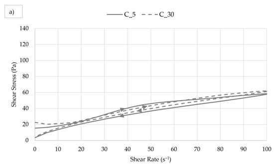 A detailed look at the flow curves of the pastes shows that a denser structure of the pastes was formed over time, as the flow curves measured 30 min after mixing lie at higher shear stress values than the 5 min flow curves. The curves also indicate the thixotropic behavior of the pure cement paste, meaning that it thinned over time during mixing. Pastes with additives showed worse thixotropy (Table 8, Figure 8), and CCH and CTCH pastes were even rheopectic at the initial stage. This deterioration of flow properties during mixing was probably caused by increased absorption of water on the large surfaces of the additive particles. Over time, the thixotropic behavior of all pastes improved. The change in the composition of the cement pastes did not have a significant effect on the character of their behavior with increasing shear rate; all pastes were pseudoplastic (shear-thinning, n < 1).