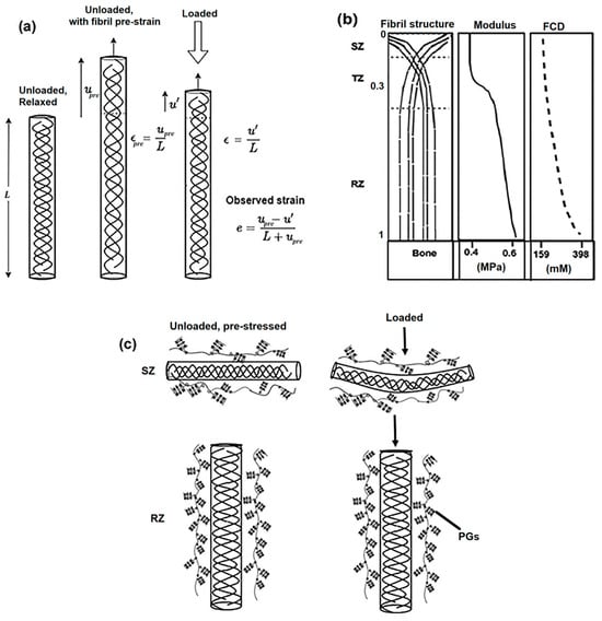 In the early models of articular cartilage, the tissue was considered to be isotropic, homogenous, and biphasic [20]. Biphasic theory models tissue as a mixture of two phases: a charged porous permeable solid phase (collagen–proteoglycan matrix) and an interstitial fluid phase. Later, a triphasic model [21] of articular cartilage was introduced as an extension of the biphasic model, where negatively charged proteoglycans are modeled to be fixed to the solid matrix, and monovalent ions in the interstitial fluid are modeled as additional fluid phases. According to the triphasic model, the swelling of articular cartilage depends on its fixed charge density distribution, the stiffness of its collagen–proteoglycan matrix, and the ion concentrations in the interstitial fluid. These models, however, lack the structural inhomogeneity and anisotropic properties of extracellular matrix and consider cartilage to be a homogenous, isotropic, and viscoelastic material, which probably does not enable the discrimination of PGs and collagen-dependent mechanical properties leading to a more accurate understanding of cartilage mechanics. To address this issue, several fibril-reinforced models (fibril-reinforced poro-elastic, poro-viscoelastic, and hyperelastic models) have been introduced to include the effect of fibril anisotropy in traditional biphasic and triphasic models [22,23,24,25]. Compared to these models, we use a simple (1D) mixture model, which is complex enough to include the depth-dependent structural inhomogeneity of collagen fibers, including fibril pre-strain and inhomogeneous distribution of FCD; yet, it is simple enough to provide an analytical solution that provides further understanding and insight. Our approach is similar to that proposed by Wang et al. [26], which can predict intra-tissue strains and displacements in conjunction with osmotic swelling pressure and the mechanical properties of the collagen fibril network under one-dimensional (1D) axial compression (confined and under equilibrium) along the depth [8].