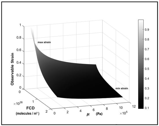 The observed strains (Equation (11)) were simulated in Figure 3 for the given ranges of FCD and as two independent parameters. When both FCD and are small, the predicted strains are large (an observed trend for the SZ of compressed cartilage), while, for larger FCD and the strains appear smaller (RZ trend).