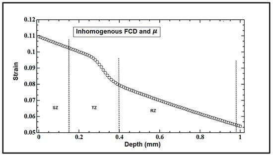 The simulated observed strain e over depth when both FCD and are varying with depth. The tri-zonal tissue has a length = 1 mm ( = 0.3 mm, = 0.09 mm) and, under the applied stress, 0.1 MPa.