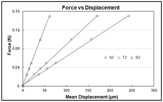 The strains averaged over the thickness of each zone (as determined by Equation (13)) are represented as zonal strains. The intra-tissue displacement for each zone of tissue can be obtained by integrating the depth-varying observed strain e along the depth and then averaging the displacement results over the thickness of each zone. In general, the RZ has the least mean intra-tissue strain and displacement compared to the SZ and TZ, consistent with what is observed experimentally [14,27]. Figure 5 represents the relationship between applied force (stress) and simulated intra-tissue displacements for three zones (SZ, TZ, and RZ) of a thin rectangular sample tissue, compressed (surface-to-surface) by increasing stress () in discrete steps (stress relaxation).