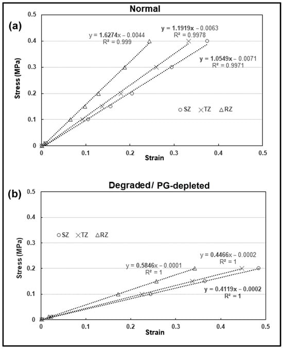 The loss of PG can cause a loss in FCD, which can be attained through different enzymatic digestions (e.g., trypsin) and is the characteristic feature of degraded tissue. As a result, tissues can experience an abnormal increase in intra-tissue strains and displacements for a given otherwise-normal stress. Figure 6b presents the stress vs. zonal strain relation for the three zones of the PG-depleted or -degraded tissue, with the same as normal (0.4–0.6 MPa), assuming no change in the intrinsic properties of the collagen fibers. The loss of PG or FCD results in a decrease in pre-strain , an increase in the intra-tissue strains (~50%) for the given stress, and, consequently, a decrease in the effective modulus (slope of linear fit) for each zone (60% for the SZ, 62% for the TZ, and 64% for the RZ). The depth-wise loss of FCD was introduced in the model by adjusting the SZ’s FCD () from 159 mM to 1.59 mM (~99% decrease) and, in the RZ, from 398 mM to 79.6 mM (~80% decrease), while the is the same as that used for the normal case. The effective modulus decreases ~50% for each zone compared to normal native tissue (Figure 6a) and is consistent with experimental findings that the selective enzymatic digestion of PGs can cause a significant drop in the elastic compressive modulus of articular cartilage [40,41].