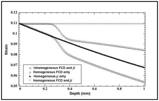 The simulated strains for the given stress ( 0.1 MPa) at different parameter conditions (FCD, , homogeneous and non-homogeneous) as a function of tissue depth.