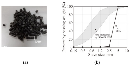 Table 4 shows the physical properties of MPAs. The absorption rate of MPAs was about 1.36 times higher than that of sand due to the large number of pores inside MPAs formed by melting several types of polymers at the same time during the melting process. Moreover, the density of the MPA where BFS fine powder was added resulted as 1.38 g/cm3, which is higher than the density of 0.77~0.89 g/cm3 for the MPA and PWA, each made of LDPE and PP [20], because the BFS fine powder filled some pores formed during the primary melting process. Meanwhile, MPAs were manufactured by cutting the plastic extruding into a long rod through the extrusion process into an aggregate size. The MPA is thus rod-shaped with relatively high flatness and low elongation, as shown in Figure 2a. MPAs also have a single particle distribution with the particle size between 2.5~5 mm, differing from the typical particle size distribution of fine aggregates, as illustrated in Figure 2b.