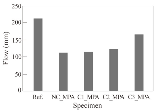 Meanwhile, the surface hydrophilization of MPAs was found to increase the workability of mortar mixes, and this is believed to be because the coating agents make the MPA surfaces glossy and smooth, which reduces the friction of the MPA surface [26]. It was found that mix C3_MPA using the surface-modified MPA with CA3, which showed the largest contact angle, had the greatest workability, and the workability was not inversely proportional to the contact angle.