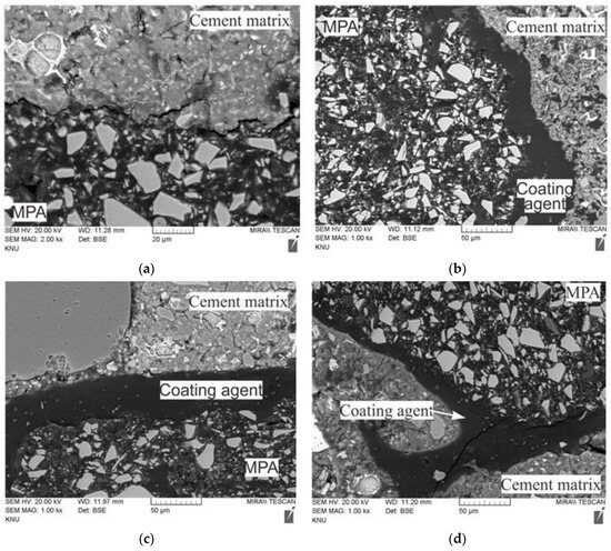 In the case of the mixtures using the surface-modified MPA, the separation between the MPA and the surrounding coating agent in some parts was also inspected, as well as the separation between the surface coating agent of the MPA and the surrounding cement matrix. In the case of mix C3_MPA using the surface-modified MPA with CA3, cracks occurred in the coating agent too. It seems that the bonds between the MPA and the surrounding coating agents were weakened as the coating agents partially reacted with the surrounding cement matrix during the cement hydration process.