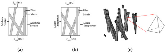 As indicated previously, the boundary conditions applied to the FEM computations could influence the value of the computed effective conductivity. The two different types of boundary conditions considered in this work are presented in this section. Thus, we use the so-called “mixed” boundary conditions (MBCs) and the “uniform thermal gradient” conditions (UTGC). These two types of boundary conditions have been commonly encountered in previous works on porous materials [26,27,28,29] and sporadically used in computer homogenization [30,31] in order to analyze the macro-homogeneity condition. For MBC (Figure 5a), a hot temperature on one side and a cold temperature on the opposite side are imposed (Equation (8)), while the other four sides are considered adiabatic by the ABAQUS software (Equation (9)):