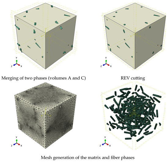 Thereafter, a second parallelepipedal volume (B) with the dimensions of the REV (length–width–height of L x - L y - L z , respectively) containing a homogeneous medium B representing the matrix is generated. A boolean operation (implemented in ABAQUS CAE) is then applied to remove the N cylinders (Volume A) from the parallelepipedal volume (B) to create Volume C. Then, Volumes A and C are gathered together inside a physical model composed of two phases (Volume A: fibers; Volume C: matrix). Finally, still in ABAQUS CAE, this physical model is cut according to the planes x = 0 ; x = L x ; y = 0 ; y = L y ; z = 0 and z = L z in order to comply with the dimensions of the parallelepipedal REV.