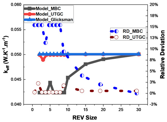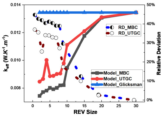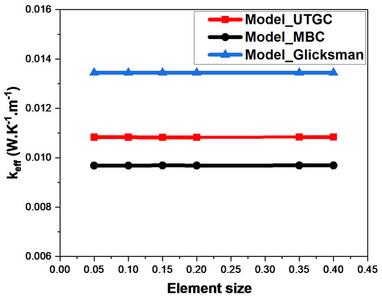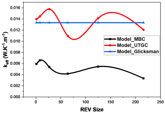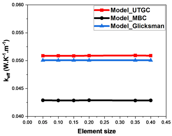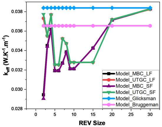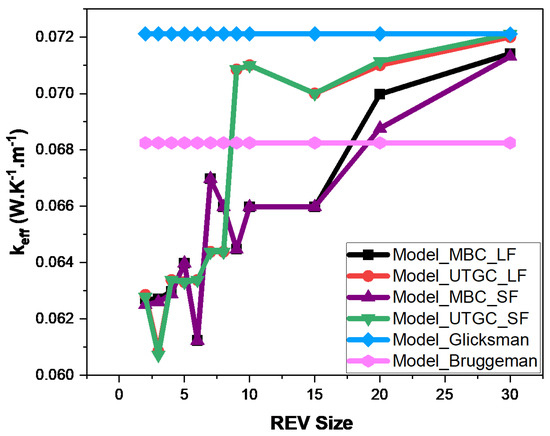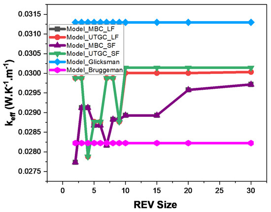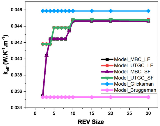 Figure 7 and Figure 8 show the weak influence of the mesh size. For each of the two boundary conditions (MBC or UTGC), when the mesh size increased, the value of thermal conductivity was practically unchanged. The mesh size was sufficiently small to calculate stable and precise results. We chose a mesh size of 0.1 for the rest of our simulations, which constituted a good compromise between the simulation accuracy and calculation time. We observed that the results of the gradient (UTGC) and mixed (MBC) boundary condition computations did not converge to the same value, probably because the REV was not large enough.