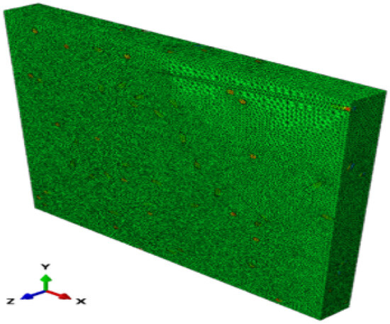 The main unknown in (Equation (4)) is the heat flux Q. Q is closely related to the conductivity and to the spatial arrangement of the different phases of the porous material, which govern the heat diffusion paths inside the heterogeneous material. Q also depends on the dimensions of REV and on the boundary conditions applied. The solution of the heat equation by means of the finite-element method is a powerful tool whose formulation is particularly well adapted to the estimation of this flux Q. This numerical method is implemented in numerous common software. In the present work, we used the ABAQUS FEM software.