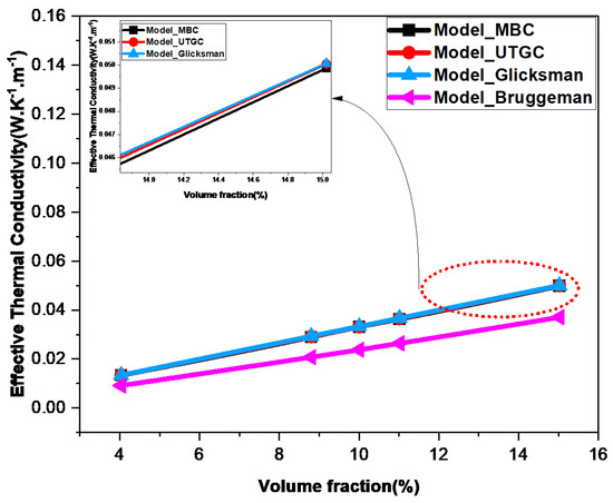 Bruggeman’s model [25] used Maxwell’s model for cylindrical particles (Equation (2)). He obtained an expression for the effective thermal conductivity in the following form: