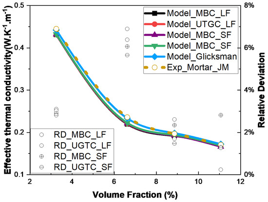The obtained numerical thermal conductivity results were compared with the experimentally [13] and analytically obtained values in Figure 19. First of all, we can see that the numerical, experimental, and analytical results followed a non-linear decreasing curve. This was due to the thermal conductivity of the mortar varying in a decreasing manner with the increased fiber volume fraction (Table 1). Indeed, the matrix porosity increased with the increased fiber volume fraction. A small discrepancy between the numerical results (MBC, UGTC, and short and long fibers) was observed. The relative differences observed between the numerical models and the Glicksman model were weak, ranging from 0.5% to 7%. These results confirmed that Glicksman’s law can be used as a good approximation, as proposed in [13].