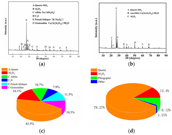 The micromorphology, phase composition, and quantitative analysis of GP and ZP are presented in Figure 1 and Figure 2. Figure 1a,b illustrates that ZP consists of flocculent and irregular block-shaped particles, while GP exhibits various irregular glassy block-shaped and flake-shaped particles. Figure 2a,b indicates that the primary diffraction peaks in ZP correspond to quartz, Al2O3, sodium feldspar, potassium feldspar, and calcium zeolite crystals, whereas the main diffraction peaks in GP are attributed to quartz and calcium feldspar. The quantitative analysis in Figure 2c,d reveals that quartz constitutes the highest content in GP, at 78.27%, while in ZP, the quartz content is 43.5%, and sodium feldspar crystals constitute 56.5%. Table 1 provides the chemical compositions of ZP and GP. Particle size distribution, obtained using a Horiba-LA-920 laser particle size analyzer, is depicted in Figure 3a,b, indicating a median particle size of 13.32 µm and an apparent density of 590.41 m2/kg for ZP, and a median particle size of 5.97 µm and an apparent density of 1060.92 m2/kg for GP.