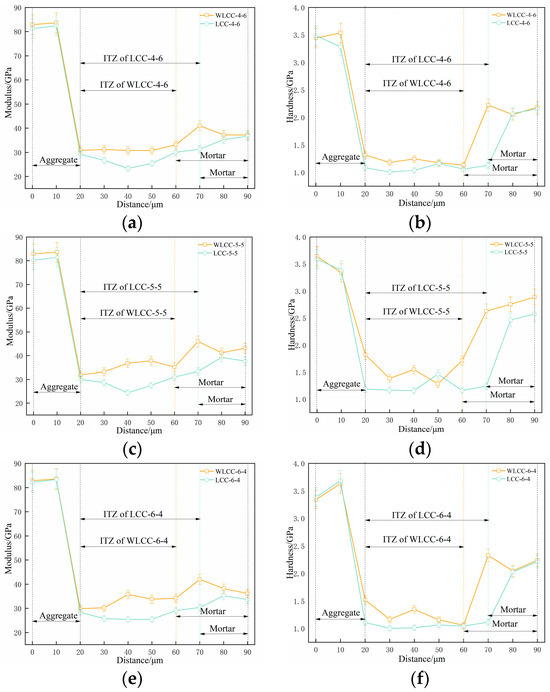 Nanoindentation testing has proved to be a valuable method for assessing the mechanical properties of aggregates, interface transition zones, and mortar in concrete. The obtained results offer explicit insights into the microstructural characteristics of concrete materials. Furthermore, the nanoindentation modulus and hardness of aggregates, interface transition zones, and mortar matrices can be computed, enabling a direct comparison of micro-mechanical properties in the interface transition zone among various concrete samples before and after activation [36,37,38]. From Figure 6a–f, it can be seen that the indentation modulus and hardness of the ITZ and mortar of the low-carbon concrete WLCC-4-6, WLCC-5-5 and WLCC-6-4 after the excitation compared to the low-carbon concrete LCC-4-6, LCC-5-5 and LCC-6-4 before the excitation underwent a large increase, while the indentation modulus and hardness of the WLCC-4-6, WLCC-5-5 and WLCC-6-4 groups were reduced by 10 μm compared to LCC-4-6, LCC-5-5 and LCC-6-4. The WLCC-6-4 group of low-carbon concrete interfacial transition zone thicknesses were reduced by 10 μm compared to LCC-4-6, LCC-5-5 and LCC-6-4. Among the components, aggregates display the highest nanoindentation modulus and hardness, followed by the mortar matrix, while the interface transition zone consistently exhibits the lowest values. Evidently, the interface transition zone emerges as the weakest segment of concrete. It is crucial to highlight that post-activation, there is a significant increase in the nanoindentation modulus and hardness of low-carbon concrete. This phenomenon is likely attributed to the OH− ions inducing substantial SiO2 dissolution in low-carbon concrete, resulting in the generation of silicate ions and the transformation of the low-density hydration phase into a high-density counterpart. This transformation contributes to a notable augmentation in the modulus and hardness of the hydration phase, while concurrently reducing porosity content. Consequently, there is an enhancement in the micro-mechanical properties of the interface transition zone.