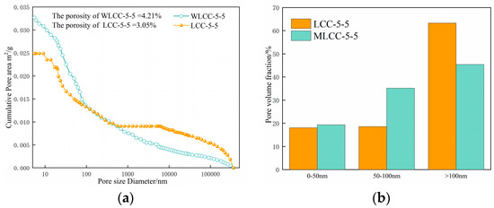 Accumulated pore volumes and volume fractions of (a) WLCC-5-5 and (b) LCC-5-5. (a) Contour analysis diagram; (b) pore volume fraction.