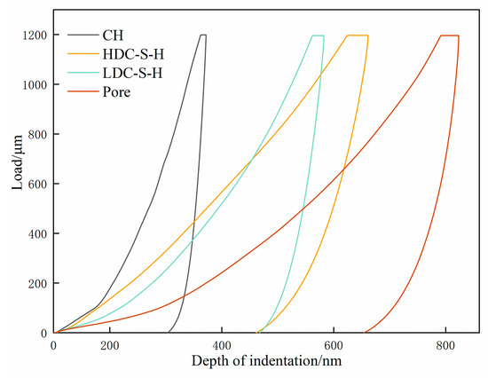 The MIP results outlined earlier lead to the conclusion that the micro-pore structure of low-carbon concrete can be optimized by introducing NaOH, thereby enhancing its micro-mechanical properties. This phenomenon, observed in prior studies, is linked to variations in the internal hydration degree of concrete and the structure of hydration products [40]. To explore the disparities in hydration phases between LCC-5-5 and WLCC-5-5, Gaussian [41] fitting was applied to the nanoindentation statistical data of both, yielding peak values (P) for nanoindentation modulus and hardness in mortar and different phases. The changes in hydration phases of low-carbon concrete before and after activation were analyzed. According to previous studies [42], the elastic modulus and hardness values of various phases in cement-based materials are different. Specifically, the elastic modulus falls within the ranges of 0 to 13, 13 to 26, 26 to 40, and 40 to 55 GPa for capillary pores, low-density calcium silicate hydrate gel (LDC-S-H), high-density calcium silicate hydrate gel (HDC-S-H), and calcium hydroxide (CH), respectively. For simplicity, only these four phases are considered, while phases with an elastic modulus exceeding 70 GPa are disregarded. The corresponding p–h curves for these hydration phases are depicted in Figure 9.