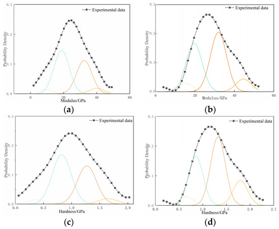 Probability distribution functions of hydration products in WLCC-5-5 and LCC-5-5 phases. (a) Modulus of hydrate phase in LCC-5-5; (b) modulus of hydrate phase in WLCC-5-5; (c) hardness of hydrate phase in LCC-5-5; (d) hardness of hydrate phase in WLCC-5-5.