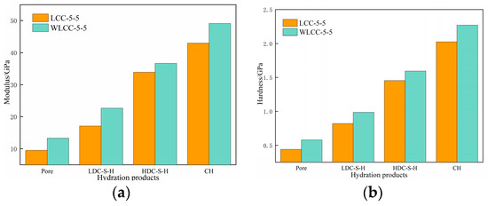 Simultaneously, with reference to Figure 12, it is observable that the volume fraction of capillary pores in WLCC-5-5 decreases by 27.55% compared to LCC-5-5, consistent with the earlier MIP results. The volume fraction of LDC-S-H gel experiences a reduction of 22.76%. Conversely, the volume fractions of HDC-S-H and CH increased by 13.91% and 23.46%, respectively. This implies that the increased presence of HDC-S-H gel and CH in WLCC-5-5 is advantageous for micro-mechanical properties. Drawing from prior studies [46,47], it is established that HDC-S-H gel and CH typically occupy relatively narrow spaces, whereas LDC-S-H is distributed in relatively wider spaces. The significant volumes of HDC-S-H and CH in the activated low-carbon concrete suggest successful filling of mesopores, resulting in a compressed and narrow transition zone. This is consistent with the findings of [48] that the elevated content of high-density hydrated phases also implies that there are more tightly packed narrow zones in the concrete, and this elucidates the optimization of the pore structure in WLCC-5-5 by the MIP test.