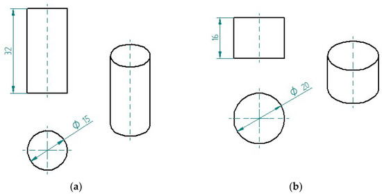 The samples of epoxy compounds (in the cured state) used for strength tests and microscopic examination are shown in Figure 2. For comparative purposes, the samples had the same dimensions and were produced under the same conditions, and their dimensions were selected in compliance with the specifications laid down in the standards ASTM D695-15 [59] and PN-EN ISO 604 [60]. The samples were fabricated using cylindrical polymeric molds. A total of 72 samples were fabricated for strength tests (6 samples per each of the 12 epoxy compounds—Figure 2a), and 12 samples were prepared for microscopic examination (Figure 2b).