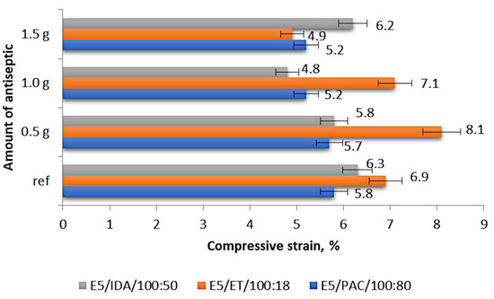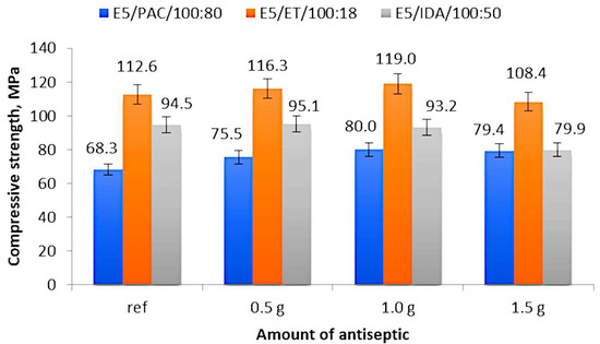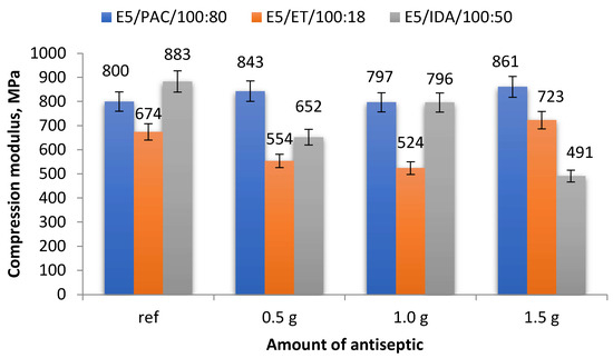 A comparison of the compression moduli (average values) obtained for the analyzed epoxy compound samples, both reference and antiseptic-modified, is given in Figure 4.