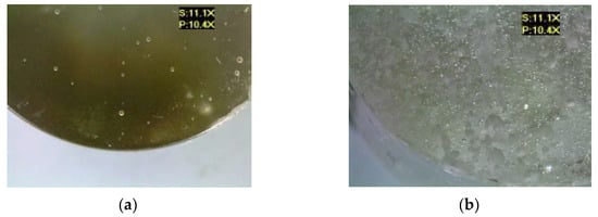 An analysis of these results demonstrates that the addition of the modifier resulted in the formation of considerably more air bubbles in the samples of the analyzed epoxy compounds. It can also be observed that the boric acid addition caused a change in the color of the compound—the sample became darker. Tambe et al. [15] also showed that the addition of modifying agents to the epoxy coating in the form of biocides caused a change in the color of these coatings, and that exposure to the SRM medium also led to changes in the microstructure and biofilm formation on the surface of the studied epoxy coatings. In this study, the modified samples also showed the presence of undissolved particles of boric acid, which indicates both the difficulty in mixing the modifier with the epoxy resin and curing agent, as well as the need to develop a correct mixing technique for the epoxy compound components. Mori et al. [21] also studied epoxy compounds containing Bisphenol A-based epoxy resins, various curing agents, and antibacterial additives (antibacterial polyelectrolyte/silver nanoparticle—Ag NP). Two types of epoxy resin were investigated to consider the effects of the resin’s chemical structure on the antibacterial activity of the filler. They also noticed that some samples had a tendency for filler particle aggregation.