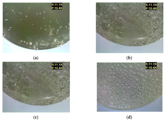 Microscopic examination results of E5/ET/100:18: (a) reference, (b) with 0.5 g of boric acid (0.42% mass fraction of boric acid in the epoxy compound), (c) with 1.0 g of boric acid (0.84% mass fraction of boric acid in the epoxy compound), (d) with 1.5 g of boric acid (1.26% mass fraction of boric acid in the epoxy compound).