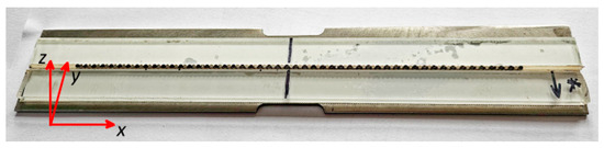The surfaces of the sensor strips were cleaned and degreased with acetone and isopropanol. A freshly prepared epoxy adhesive layer was applied to the laminate and metal surfaces. The sensors were then affixed within the designated areas on the surfaces of the laminate samples and pressed onto the substrate using a 0.5 mm thick PTFE (polytetrafluoroethylene) film as a shim. A pressure of approximately 1 kg/cm2 was maintained for 24 h during the adhesive curing process. After this time, the masking tape markers were removed, the surfaces of the samples and sensors were cleaned with isopropanol, distinct markings were made on the sample surfaces, and the sensors were magnetized and preliminarily measured for the applied magnetic pattern. Figure 2 illustrates a sample with the strip sensor and its dimensions.